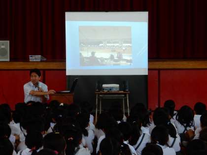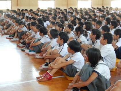 6月の朝会は、先日行われた運動会の子どもたちのがんばりをみんなで見合いました。みんな自分たちの演技の様子が映し出されると、目を輝かせて見ていました。そして、その後、通学路の危険な場所の様子を映像で紹介しました。実際映像で見てみると、どれだけ車が自分たちの近くを通るのかがよくわかりました。
