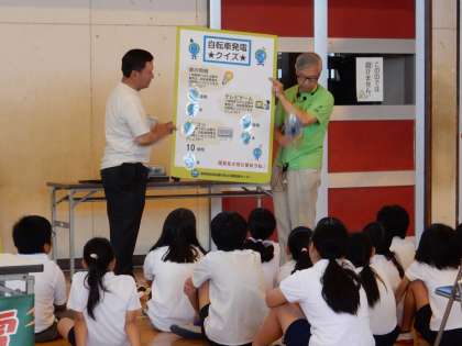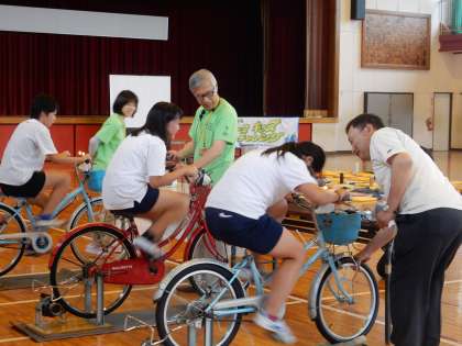 5年生が、自分たちの生活を見回して、資源を大切に使うために何ができるか考えました。電気をつくることがどれだけ大変か、自転車で発電体験をしました。