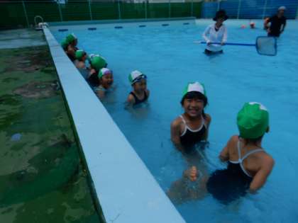 1,2年生が、お日さまをいっぱい浴びながらプール開きを行いました。ゴルフボール拾い、せんたくきなどとても楽しそうにプールの中を動いていました。