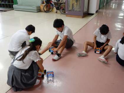 4年生が理科の「電気のはたらき」の学習でいろいろなつなぎ方の学習をした後、つなぎ方を変えて走り方のちがいを確かめました。スピードの出る車、プロベラが回るようにする車など、つなぎ方を変えていろいろな走り方を楽しみました。