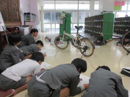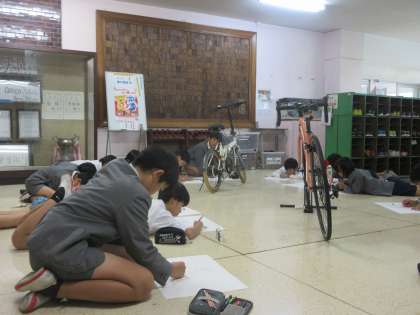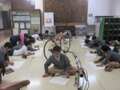 朝の合同あいさつ運動と同じ生徒玄関で、図工の授業、お話の絵「自分のダビデ号」を描いていました。