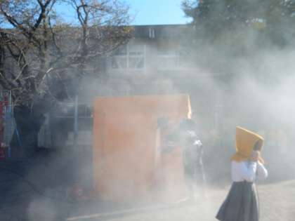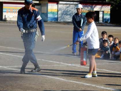理科室から火災が発生したことを想定した火災避難訓練を行いました。実際防火扉をくぐり、煙体験をして避難しました。避難後は、代表の6年生や先生方が消化器で火を消す訓練も行いました。最後に消防署の方から、火事のおそろしさや火事になった時どうすればよいのか、そして、火事をおこさないためにわたしたちは何を気をつければよいのか教えていただきました。