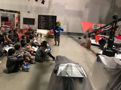 テレビ番組を制作しているスタジオに入った子どもたちは、セットやさまざまな機械に興味津々の様子でした。