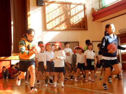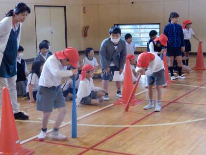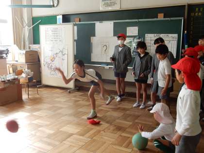 昨年の運営委員の子どもたちが考え、3学期に行う予定だったウキウキスポーツ大会のあそびですが、かぜが流行しやることができませんでした。2年越しに今年の運営委員の子どもたちが引き継ぎ行うことができました。たてわり班ごと、とても楽しそうにグループであそびに挑戦していました。