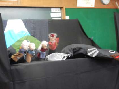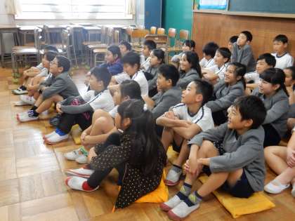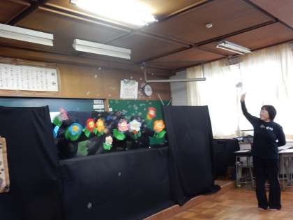 人形劇どんぐりのみなさんが、新作「かなめ石」と「かめとうさぎ」を上演してくださいました。今回は、社会科で地域の発展につくした人々の学習をしている4年生が、原にあるかなめ石もとにしたお話を聞きました。みんな、時には歌いながら、時には動作をつけながら、とても楽しそうに聞いていました。