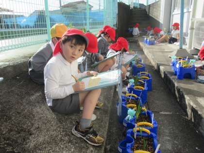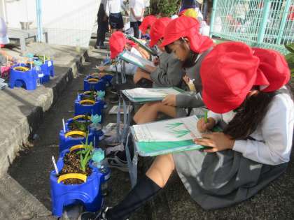 1年生は球根を育てています。ここのところの温かさからか芽が出てどんどん伸びています。一生懸命にスケッチをしていました。チューリップやラナンキュラス、クロッカス、フリージアなどです。