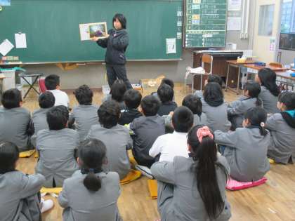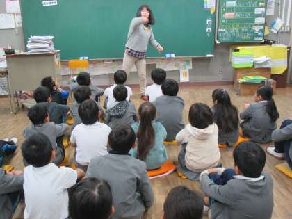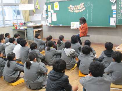 4年生は、「たこ」「あしたのてんきは はれ?くもり?あめ?」。5年1組は、「ぜったい ぜったい おしちゃダメ×」「こねて のばして」。5年2組は、「きつね森の山男」「富士山うたごよみ」。を読んでいただきました。