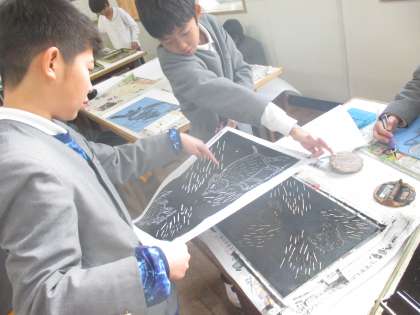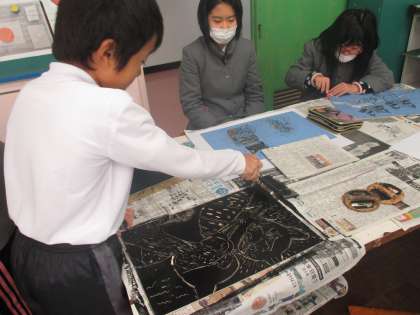 本を読んで心に残った場面を木版画で表現しました。そして、ペアで協力しながら刷りました。