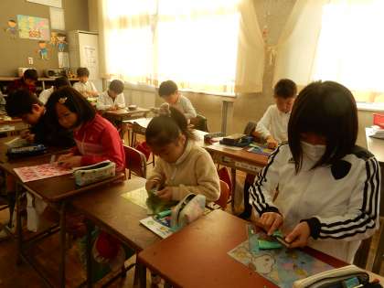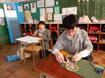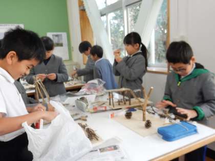 3年生は、図工の時間に校長先生に小刀の使い方を教えてもらい、木を削る練習をしていました。4年生は、自分たちで集めた枝や、木の実を使って楽しい空間を作っていました。6年生は、お話の絵の背景を、いろいろな技法を使って、えがいていました。