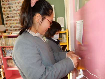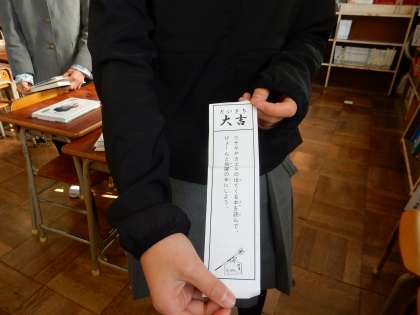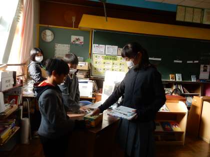 図書委員会の人たちが、図書館のいろいろなジャンルの本を読んでもらおうと、図書おみくじを考えました。図書館に来た人が、興味深げにおみくじを引き、おみくじに紹介されてあった本を手にとっていました。