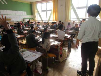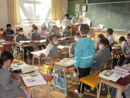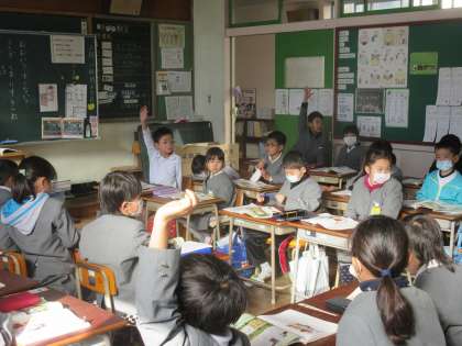 先週は学級閉鎖をした1年生ですが、暖かい日差しが差し込む教室で、全員元気に国語の授業を行っています。