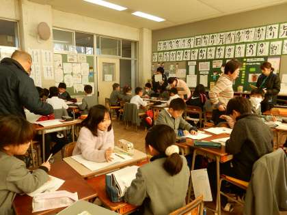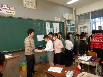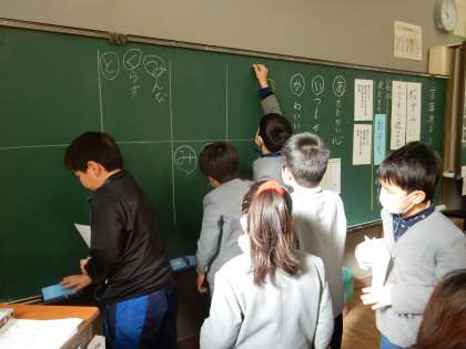 3年生が、国語の時間に「言葉で遊ぼう」の学習の中で、折り句(言葉がかくれた文)について知り、どの言葉が一番合うのか交流しながら友達のいいところを折り句に作る活動をしました。抽選でひいた封筒の中に入っている名前の友達の折り句を作りました。封筒の中の友達の名前を確かめると、みんなその子のことを考えながら、作業を始めました。黒板に紹介された友達が作った自分への折り句を見ながら、とてもうれしそうでした。教室の中が、とてもほかほかした雰囲気で折り句作りが行われました。