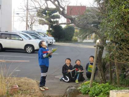1時間目の4年生理科では1年を通して植物の観察をしています。ビオトープ横の梅の木は、もう芽が出ているようでした。春は少しずつ近づいています。