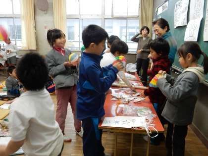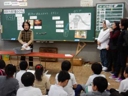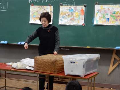 3年生が、社会の「かわってきた人々のくらし」の学習で、昔のくらしについて、外部講師の方々にお話を聞きました。65年前の生活がどんな様子か、どんな遊びをしていたのか実際使っていたものを見せていただきながら、メモをとっていました。電化製品がない時代のせんたくの仕方や、買い物のしかたなど紹介される度に、みんな驚きの声をあげていました。