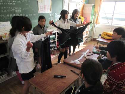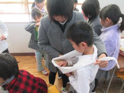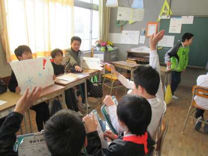 5年生が、防災について学んだことを、チームに分かれて、3年生にわかりやすく伝えました。体験やクイズに楽しそうに参加している3年生が、印象的でした。