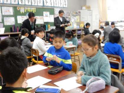 2年1組は、算数「たし算とひき算」で計算方法を、図を使って考えました。3年1組は、国語で「考えを整理しよう」の学習を行っていました。4年1組は、国語「手で食べるはしで食べる」の学習で、文化のちがいを考えました。