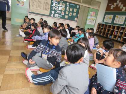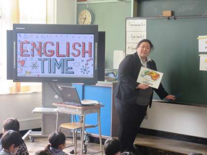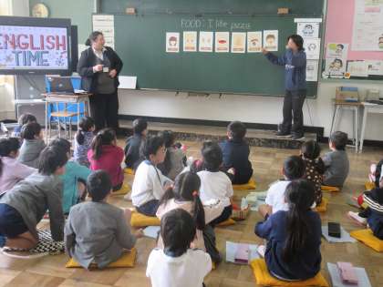 1年生、2時間目は英語ルームにてALTのトモエ・ウスキ先生と鈴木恭子先生による英語です。今日のテーマはFOOD(食べ物)です。ハンバーガーやピザ、スパゲティなど普段話している言葉と違う発音でしたが、リズムよく対応できていました。
