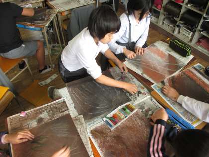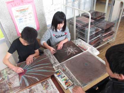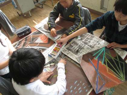 画用紙を暗い色のコンテでぬりつぶした後消しゴムで線や模様を思い思いに描きました。消すことで描くという初めての経験に、みんな夢中で取組みました。クレパスで少し色をたして完成です。