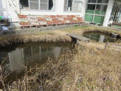 浮島小ならではのビオトープの池には、もうすでに、たくさんのメダカが元気に泳いでいます。