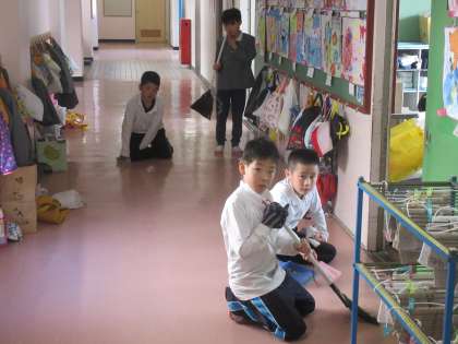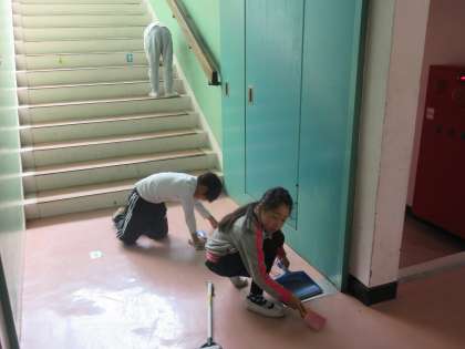 1年生の階段清掃、2年生の教室、廊下清掃の様子です。