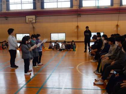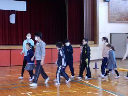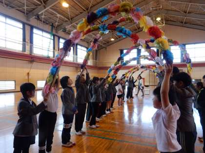 6年生を送る会の準備が、5年生を中心に着々と進んでいます。1年生と6年生が入場するときの動きや、4年生が、6年生の入退場する時のアーチの並び方などを確かめました。