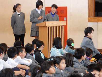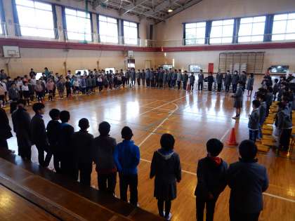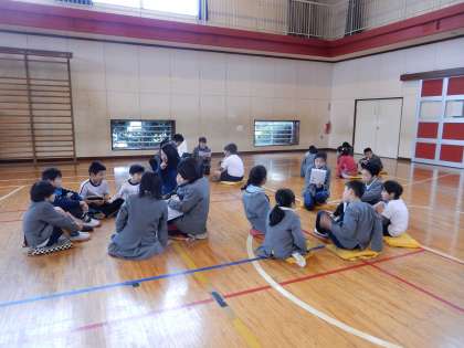 6年生を送る会にみんなで歌う「やってみよう」の替え歌バージョンの練習を、1〜5年生みんなで行いました。その後、たてわり解散式の流れについて、5年生が、たてわり班にわかれて下級生に説明しました。みんなで心を込めて6年生にありがとうの気持ちを伝えたいです。