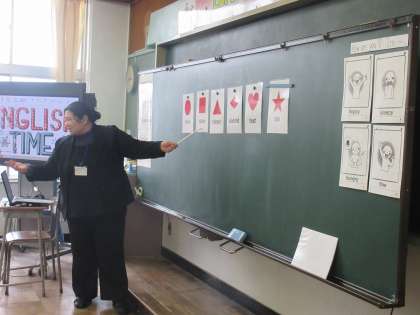 1年1組、2時間目は鈴木恭子先生とATLのトモエ・ウスキ先生の英語です。参観ではShapes(シェイプス)「形」をテーマにして、circle(サークル)円、triangle(トライアングル)三角、square(スクエア)四角、diamond(ダイアモンド)ひし形などの形を、リズミカルに指で表す活動中でした。体の表現とともに発音する学習に、興味深く、とても楽しく学習する1年生の皆さんです。