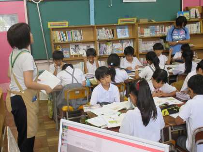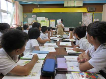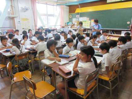 3年1組 5時間目は図書室で。図書館司書の先生に「本のポップをつくろう」をやっていただきました。図書室で35人がみんなで授業ができるのも、昨年から本棚やレイアウトを変え机や椅子を運び、模様替えをした成果です。これからも図書室を有効に活用していきます。