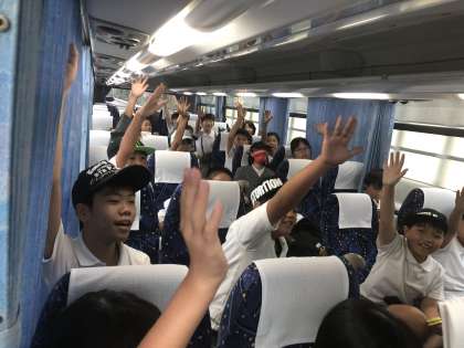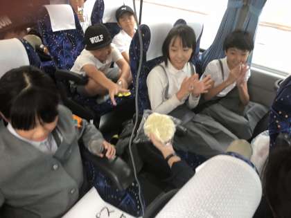 バスね中では、最後ねレク、クイズに当たるとメロンパンとジュースです。