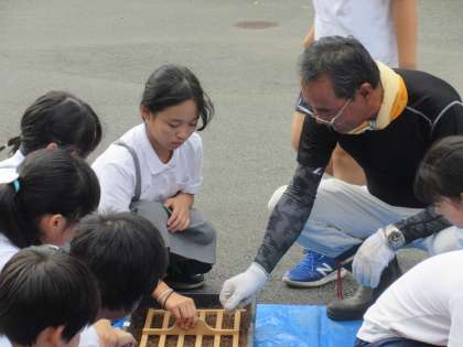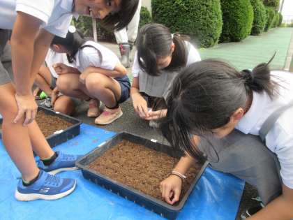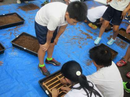 5時間目5年1組は、用務員さんに教えていただきながらマリーゴールドの種まきをしました。