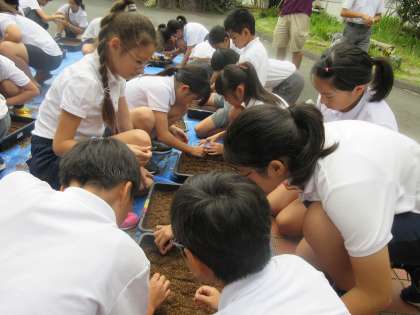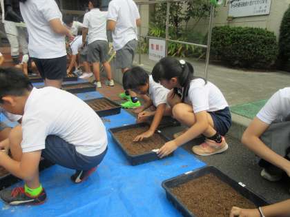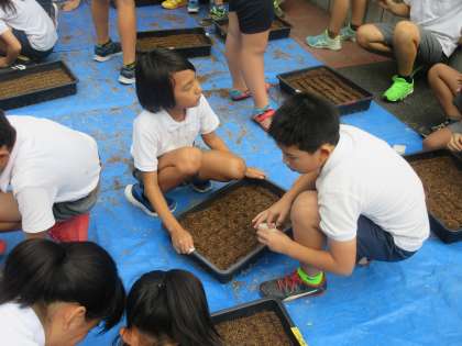 等間隔で均等に種をまく穴を空ける木製の器具で印を付けてまきました。
