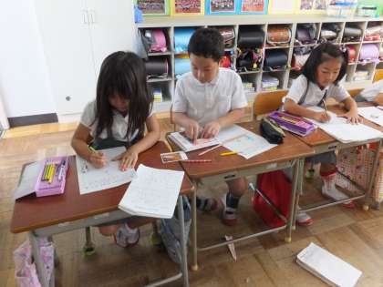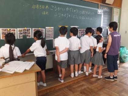 1年生は、昨日の校外学習の写真を見ながら、カードに楽寿園での思い出をまとめていました。