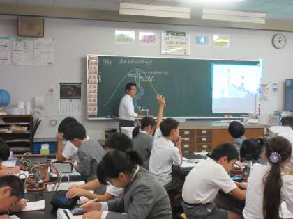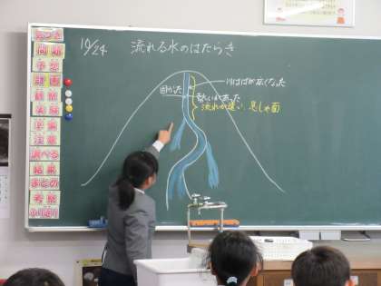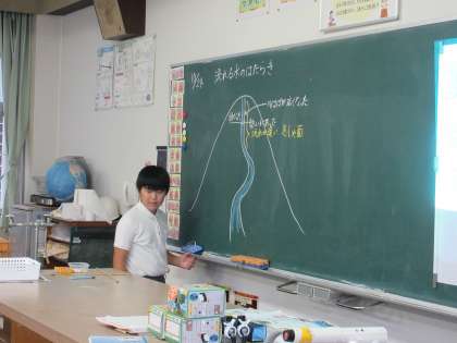 5年1組、5時間目理科では「流れる水のはたらき」の学習です。今回の台風19号での被害を考えると、川のどこがあふれやすいのかを知るこの学習は、実生活に直接つながる学習です。