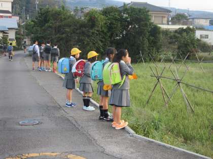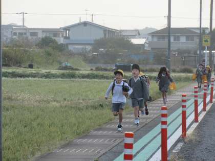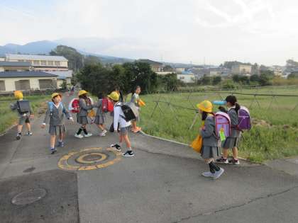 秋晴れの中、登校途中で仲間を見付けた子どもたちが、大きな声で呼びかけ、気付いた仲間が走って合流する場面です。