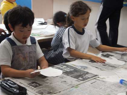 顔のパーツを作り、ていねいに貼り合わせた作品を嬉しそうに見せてくれました。どの子もとてもよくできています。刷るのが楽しみです。