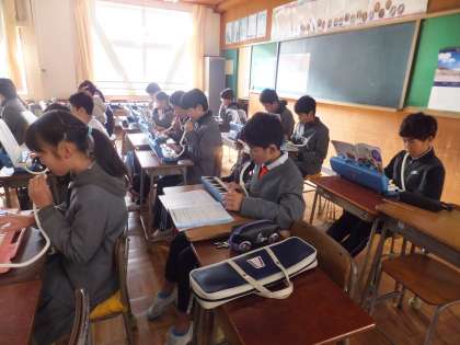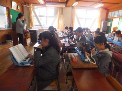 音楽の授業です。指づかいもスムーズになりました。どの子も上達しています。
