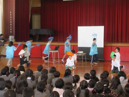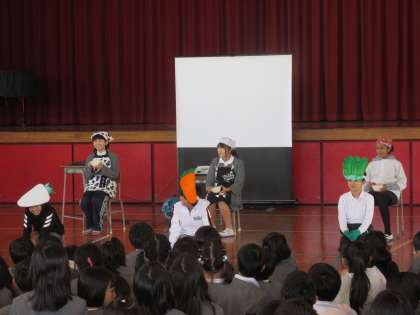 給食保健委員の劇では、大根、ニンジン、ピーマンが嵐から守られ育てられ、収穫、出荷され、調理されて給食となるまでを表現しました。栄養士の先生の「いのち」をいただいているというお話を聞いて、あためて野菜をしっかり食べる場面となりました。