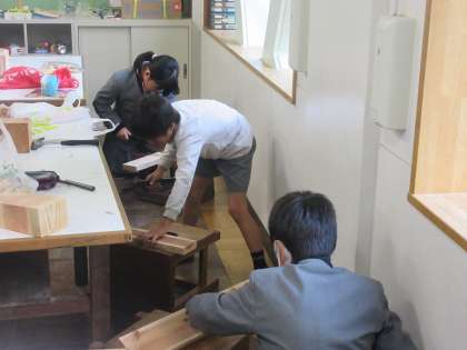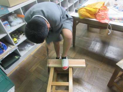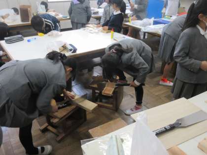 3年1組1時間目は、図工「つないでいくと」です。両刃のこぎりを使って、木材を切断していく作業を行いました。