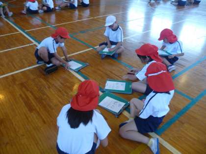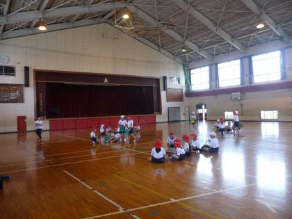 体育の授業です。これから、キャッチバレーボールに挑戦です。