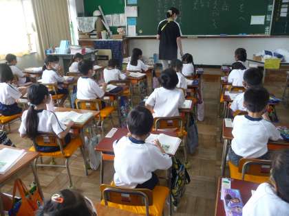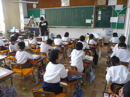 国語の授業です。助詞の「は」「を」「へ」を使う練習です。教科書を使って、文を作っています。