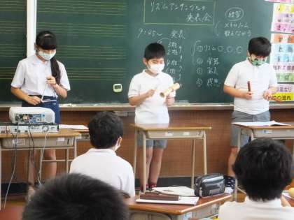 一つの班の発表が終わると、「音と音の重なりがきれいだった。」「リズムが正確でよかった。」など、感想を出し合っていました。