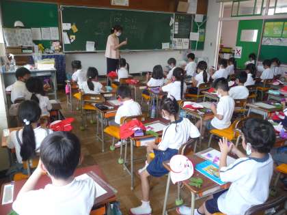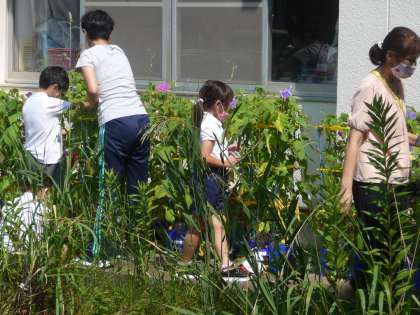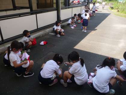 育てているあさがおの花と葉っぱを取ったら、教室に戻って、こすり染めに挑戦です。
