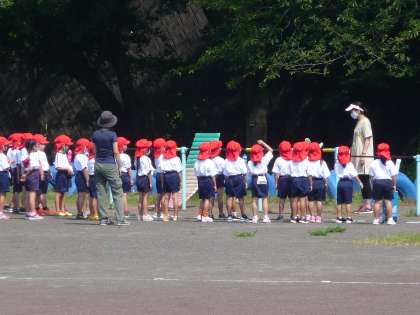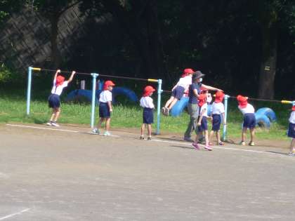体育の授業です。整列して先生の説明を聞いたら、鉄棒に挑戦です。