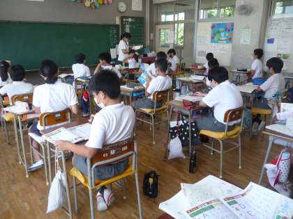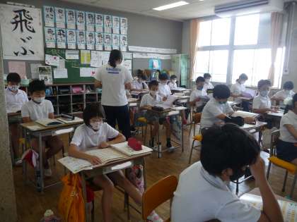 英語の授業です。今日は、フォニックス(アルファベットの文字と発音の法則をまとめたもの)を学習しています。