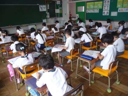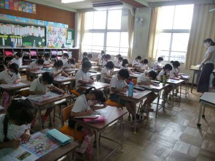 国語のテストです。黙々と取り組んでいます。先生から、テストの受け方について注意されることもなくなり、すっかり小学生らしくなりました。