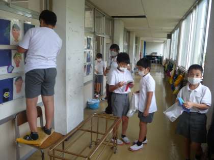 1学期に製作した作品や、プリントなどを、全員で片付けています。