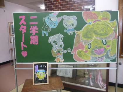 児童玄関で、子供たちを出迎え、見送っているチョークアート。