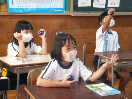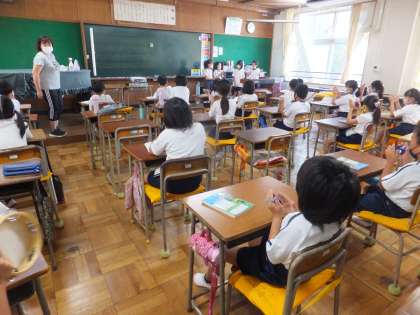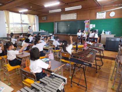 2年生は、音楽の授業でした。曲に合わせて、カスタネットやタンブリンを演奏していました。子供たちが自分で作ったオリジナルのリズムのようでした。みんな笑顔でとても楽しそうでした。