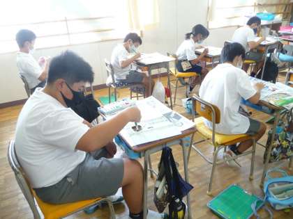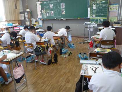 図画工作の授業です。「実物の特ちょうをとらえて描こう」をテーマに、絵画に挑戦しています。