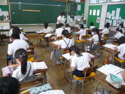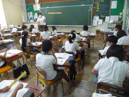 算数の授業です。ものさしを使いながら、教科書にある物の長さを測っています。